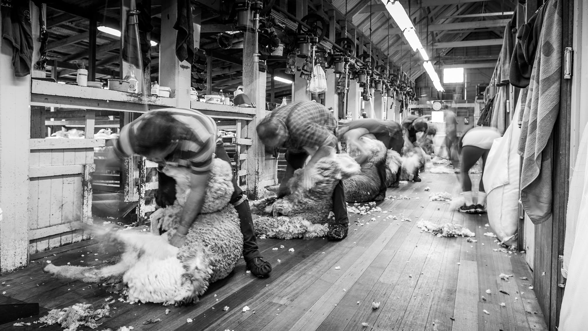 Before dawn, the shearing shed hums with rock music as shearers prepare for the day’s work. Shearing is an intensely physical task—sheep weigh up to 80 kilograms each and each worker handles hundreds of them daily, balancing speed with care.
